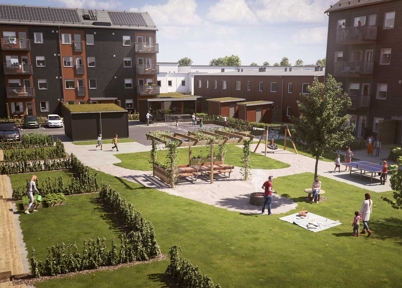 Tillsammans med äppelgrannarna BoKlok Melba och BoKlok Aroma bildas ett mysigt och grönt kvarter med två innergårdar där det finns utrymme för allt från lek, familjehäng och rofyllda fikastunder under äppelträden.