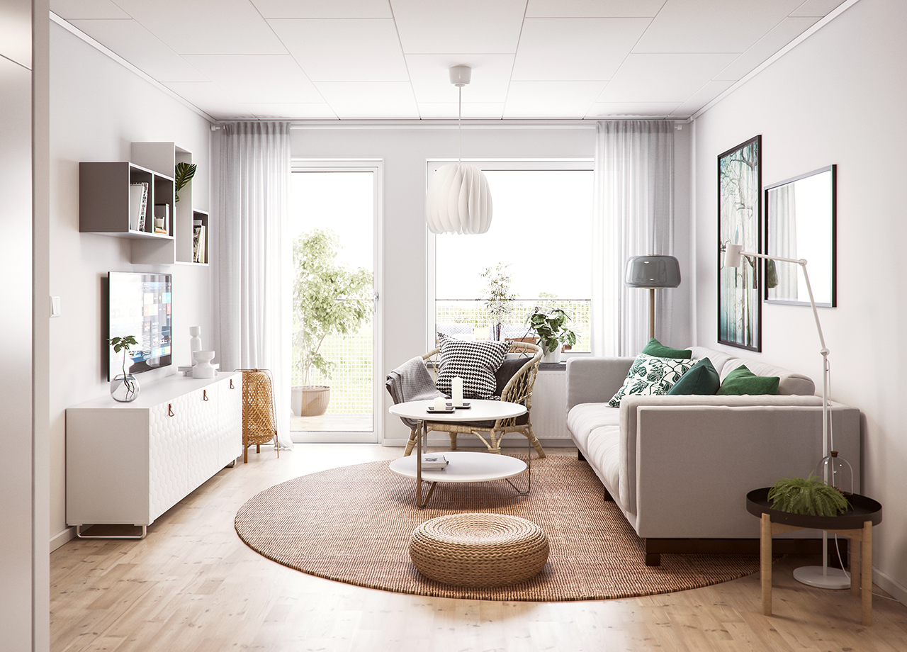 Entré med förråd och ingång till badrum med egen tvättmaskin och plats för torktumlare. Ett modernt, vitt IKEA kök som är öppet mot vardagsrummet och hela vägen till lägenhetens uteplats. Ett större sovrum på ena sidan, två små på den andra. Och en rejäl klädkammare som rymmer det du vill dölja. Vad mer kan man begära av en modern fyra? Jo, trägolv, fönsterbrädor i natursten och vita väggar som en bas till din egen inredningsstil.